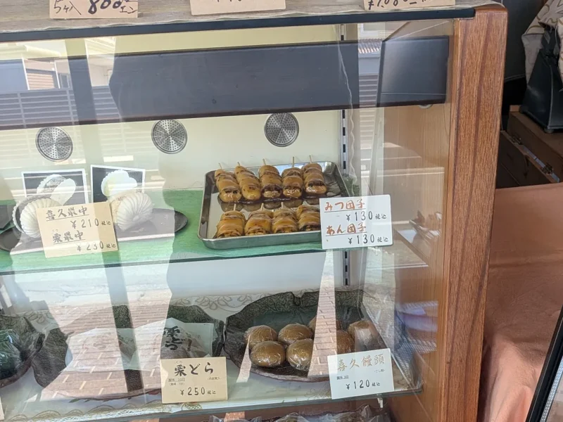目の前の大きなガラスケースには、丁寧に作られた和菓子がずらりと並んでいます。自家製の「喜久饅頭」や「栗どら」、色鮮やかなお菓子から赤飯まで、多種多様なラインナップです。どれを購入しようか迷ってしまいますが、今回のお目当てはショーケースの中でひときわ食欲をそそる輝きを放っていたお団子です。