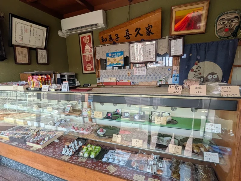 お店は上辺見の道路沿いに位置しており、昔ながらの趣ある佇まいが目を引きます。立派な文字で「和菓子 喜久家」と掲げられた重厚な看板や、店先の風情ある外観から、地元で長く愛され続けている歴史と温かみを感じ取ることができます。