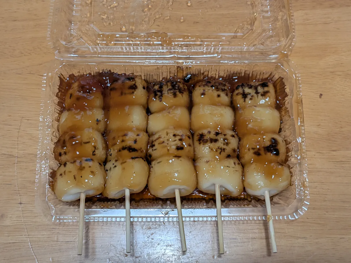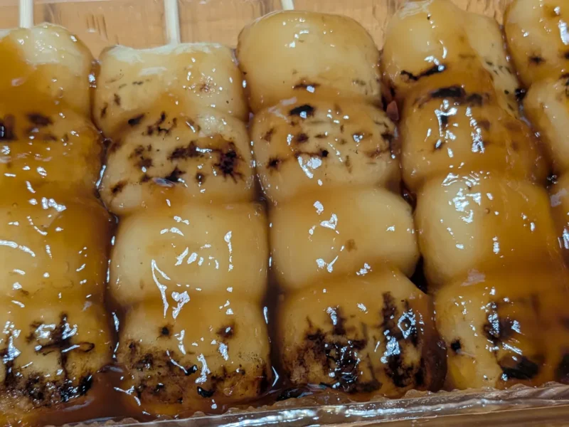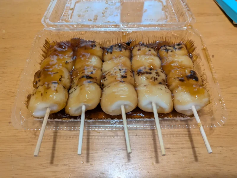 艶やかなみたらしダレがたっぷりと絡んだお団子には、職人の手による美味しそうな焼き目がしっかりと付いています。