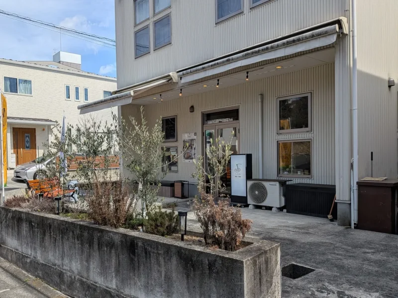真っ白な壁が印象的な、シンプルで洗練された佇まいです。入り口付近にはお店の看板が控えめに掲げられており、隠れ家的な雰囲気が漂っています。