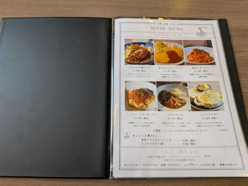 「大人のお子様ランチ」や「絶品ナポリタン」など、昔ながらの喫茶店を思わせる心躍る洋食メニューが並びます。こちらのランチメニューをすべて制覇したいという目標があり、今回は「昔ながらのオムライス」を注文することに決めました。