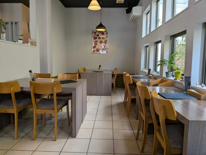 大きな窓から自然光がたっぷりと差し込み、明るく開放的な空間が広がっています。カウンター席とテーブル席が用意されており、お一人様でもグループでも落ち着いて食事ができる環境です。ゆったりとした時間が流れており、愛犬と一緒にリラックスして過ごすことができます。