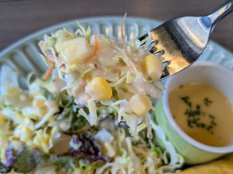 キャベツをメインに、コーンがトッピングされたシンプルなサラダです。野菜のシャキシャキとした食感が心地よく、さっぱりとした味わいが食前の胃を優しく整えてくれます。