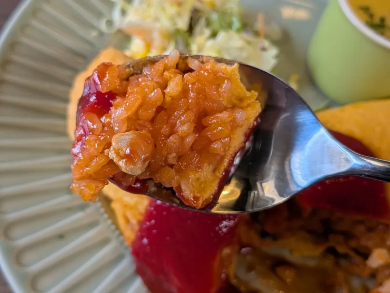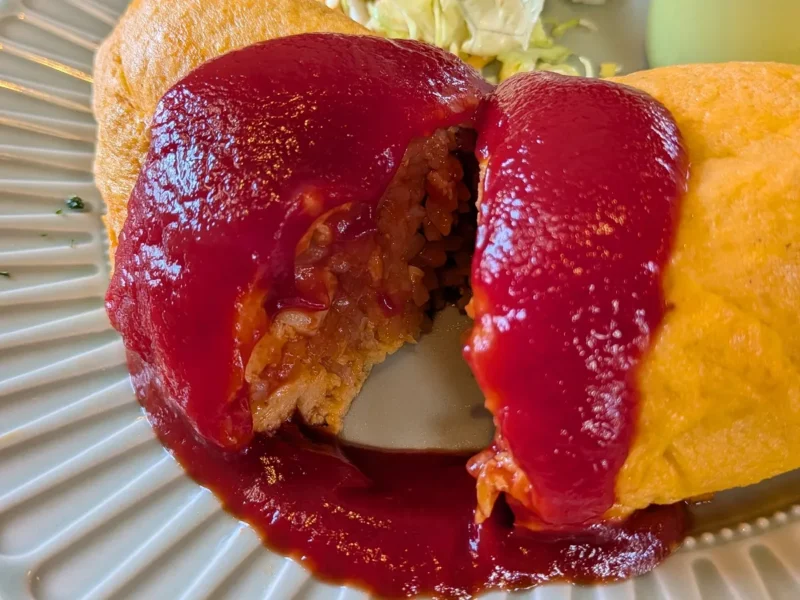 卵を割ると、中からツヤのあるケチャップライスがぎっしりと顔を出します。卵の黄色とライスの赤色のコントラストが非常に美しく、丁寧に作られていることが一目でわかります。