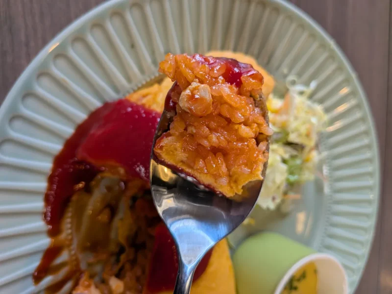 ライスの中には大きめにカットされた鶏肉がごろごろと入っており、しっかりとした肉の旨味と食べ応えを感じます。卵の優しい風味と濃厚なケチャップライスが絶妙に絡み合い、最後まで飽きることなく食べ進められます。