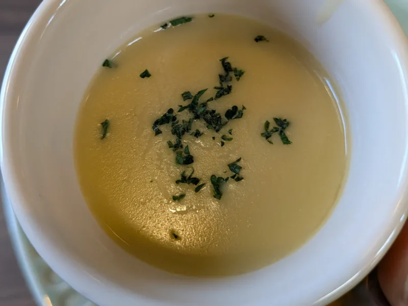 パセリが散らされた温かいスープは、まろやかで優しい口当たりです。オムライスの濃厚な味わいを程よく中和してくれ、ホッと一息つける癒やしの存在です。