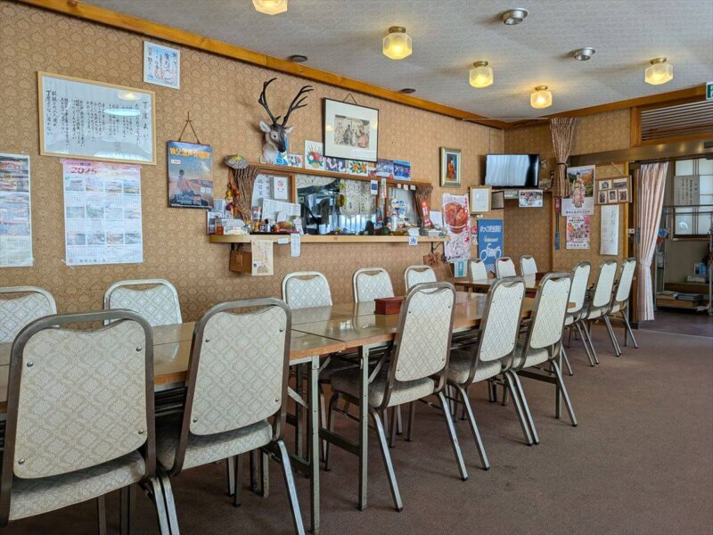 店内に入ると、そこには「これぞ日本の食堂」と言わんばかりの落ち着く空間が広がっていました。 壁一面に貼られた手書きのメニュー、そして小鹿野(おがの)という地名にちなんでか、立派な鹿の剥製が飾られているのが印象的。テーブル席が並ぶ広々とした空間は、ツーリング仲間の大人数で訪れても安心です。