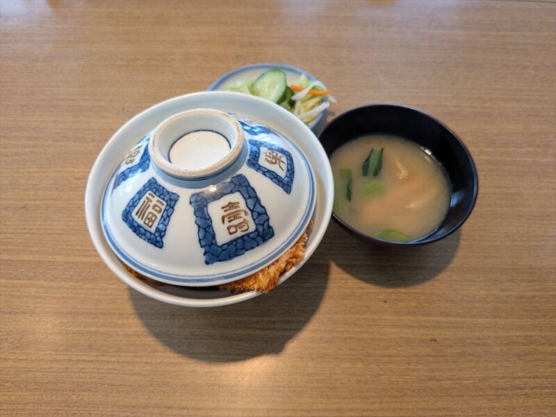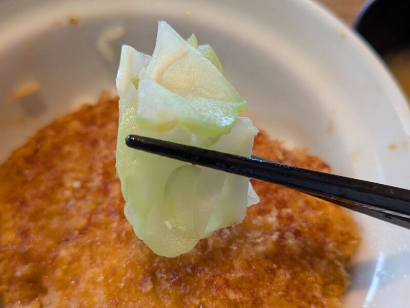 セットで付いてくるお味噌汁お新香も侮れません。 お味噌汁は、お豆腐と葉物野菜が入った優しい家庭的な味わい。カツの脂をすっと流してくれます。 そして、自家製と思われるお新香(きゅうり、キャベツ、人参)。このシャキシャキとした食感と程よい酸味が、ボリューム満点の丼を最後まで飽きずに食べさせてくれる素晴らしいアクセントになっていました。