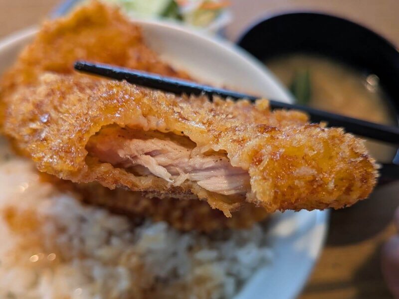 箸でカツを持ち上げると、そのずっしりとした重みを感じます。 「わらじかつ」の特徴は、お肉を叩いて薄く伸ばしていること。鹿の子のカツも、衣はサクッとした食感を残しつつ、お肉は驚くほどしっとりと柔らか。厚すぎないからこそ、タレの味が芯まで染み込んでいて、噛むたびに旨味が溢れ出します。味の決め手は、醤油ベースの甘辛い秘伝のタレ。 これがもう、絶妙な塩梅なんです。甘すぎず、しょっぱすぎず、揚げたての衣にジュワッと染み込んだタレが、硬めに炊き上げられた白米と最高の相性を誇ります。ご飯にまでしっかりとタレが染みていて、これだけで何杯でも食べられそうな勢い。