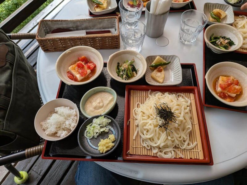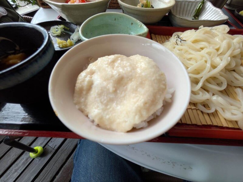 お待ちかねのセットが到着。お膳の上には、輝くうどん、たっぷりのとろろ、そして嬉しいことにミニ麦飯まで付いています!