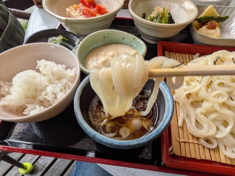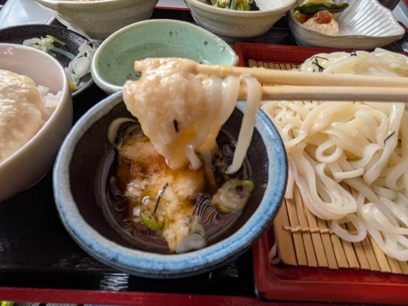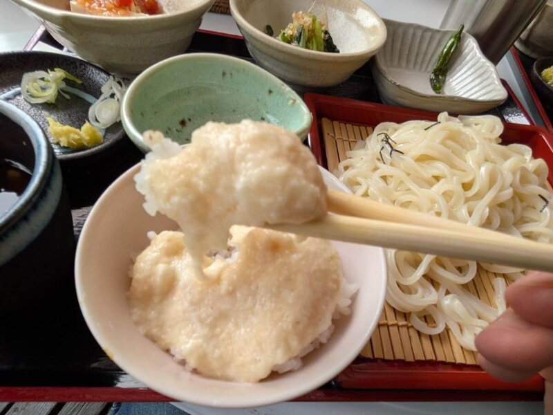 いよいよ、粘り気の強いとろろをドバッとうどんに投入。出汁の効いたツユととろろが麺にしっかり絡みつき、口の中が幸せでいっぱいに。