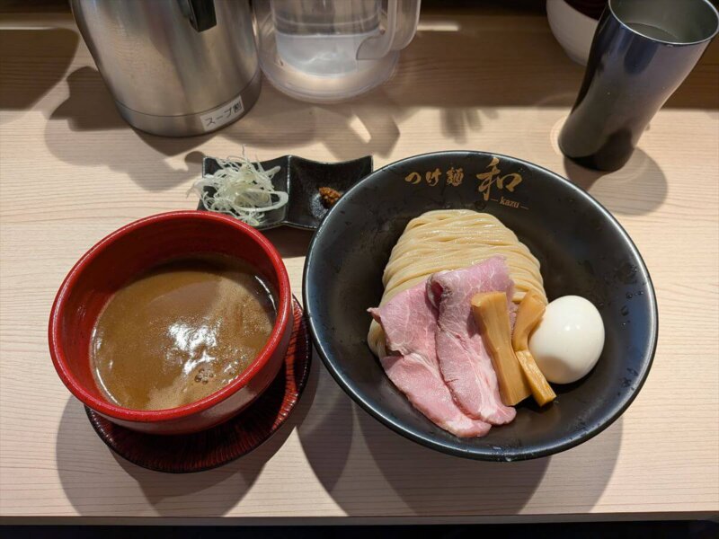 つけ麺(並)+味玉 1,400円を購入しました。後で気づいたのですが100円UPで特製つけ麺のほうがボリュームがあったようでした残念です。
