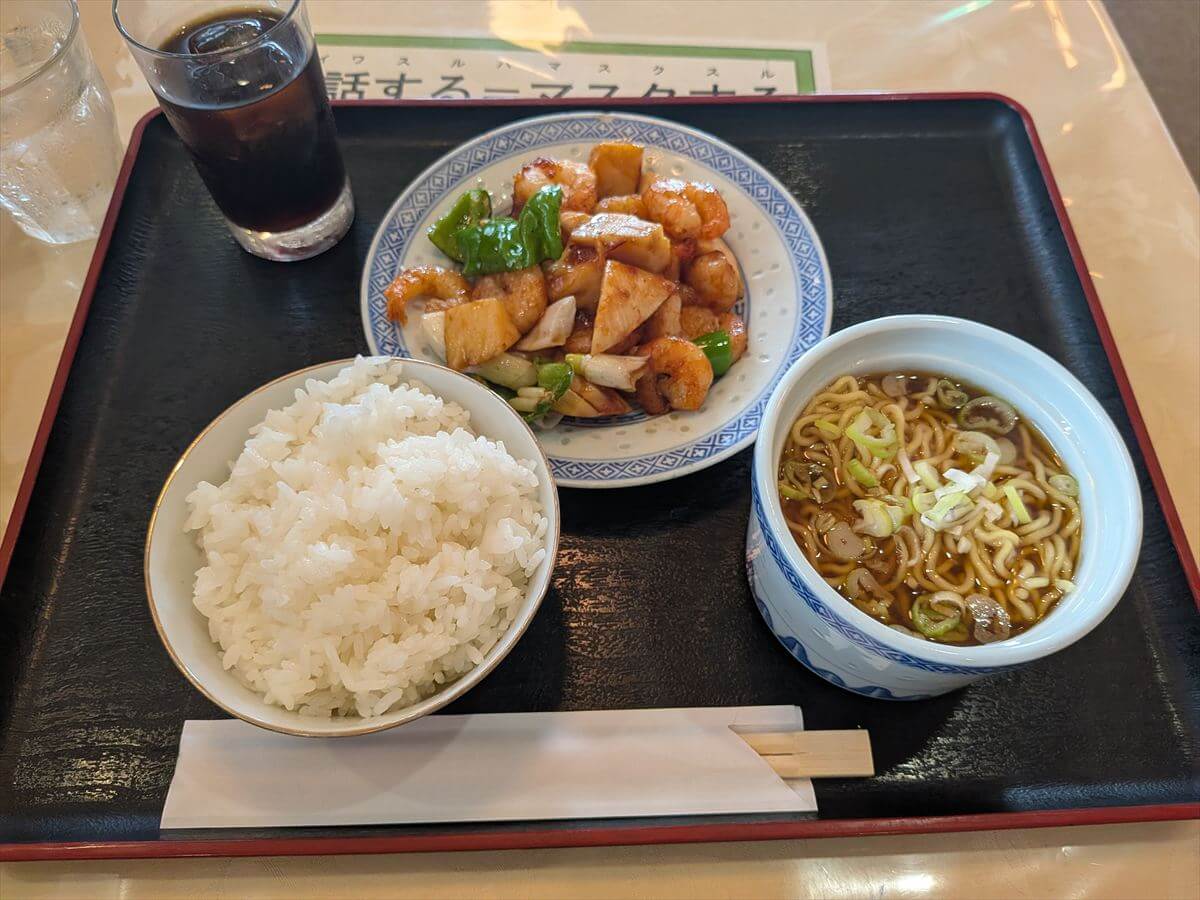 店内は昔ながらのテーブル、椅子でした。厨房にはおじいちゃん店主がワンオペで調理をしているようです。他のお客さんのランチを完成後に注文を聞く感じで海老の辛酢炒め 1,100円をお願いしました。